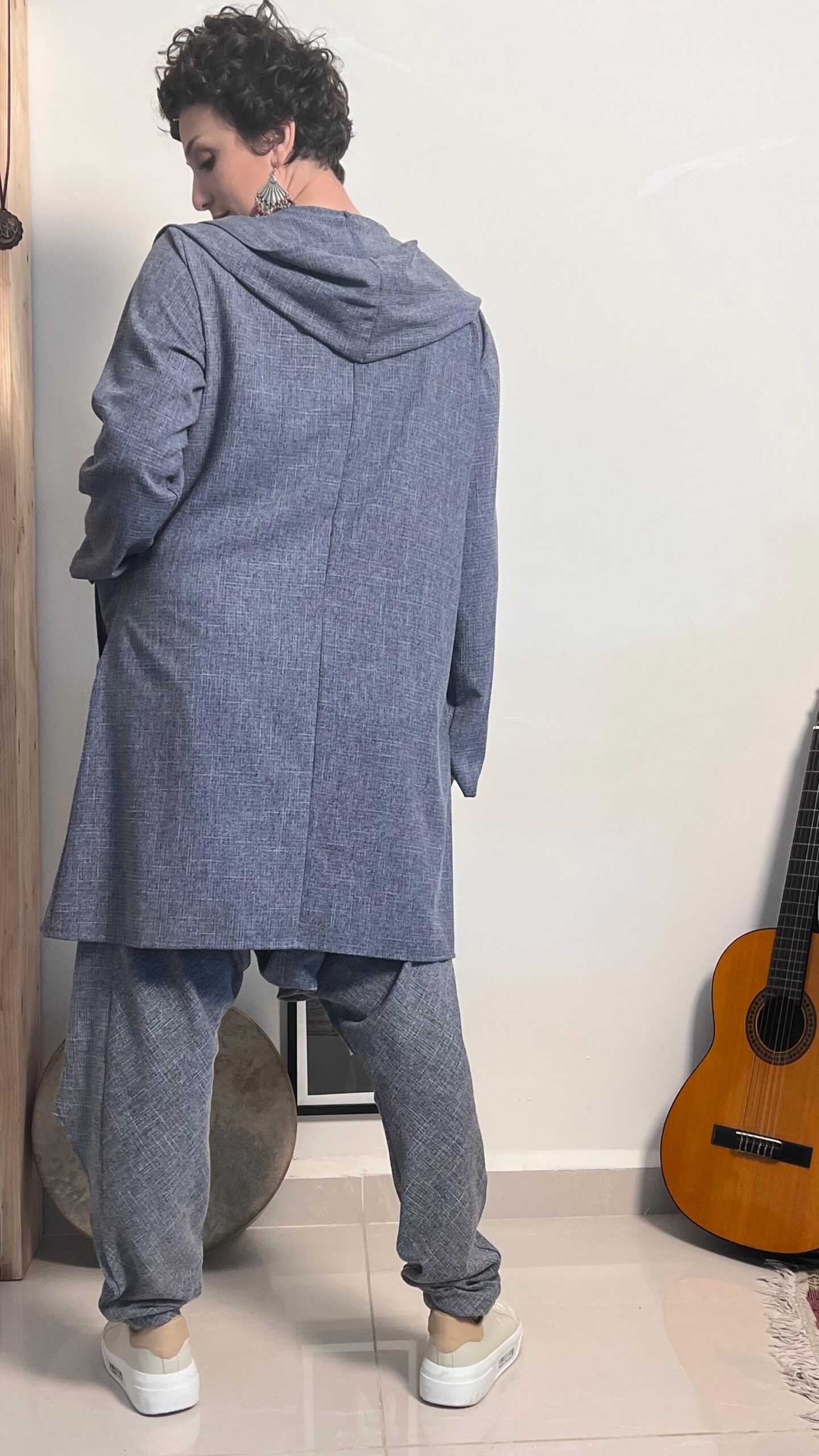 The Effortless Wanderer Set is composed of fluid single-ply harem pants paired with a softly structured V-cardigan, designed to move with quiet confidence. The silhouette is relaxed yet intentional, offering volume without heaviness and elegance without effort.